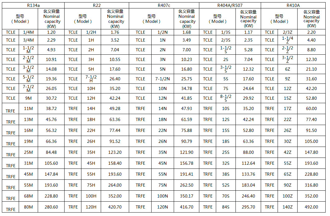 注:名義制冷量是基于蒸發(fā)溫度te=4.4℃,冷凝溫度tc=40℃,閥前制冷劑溫度為t1=38℃。